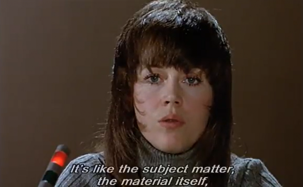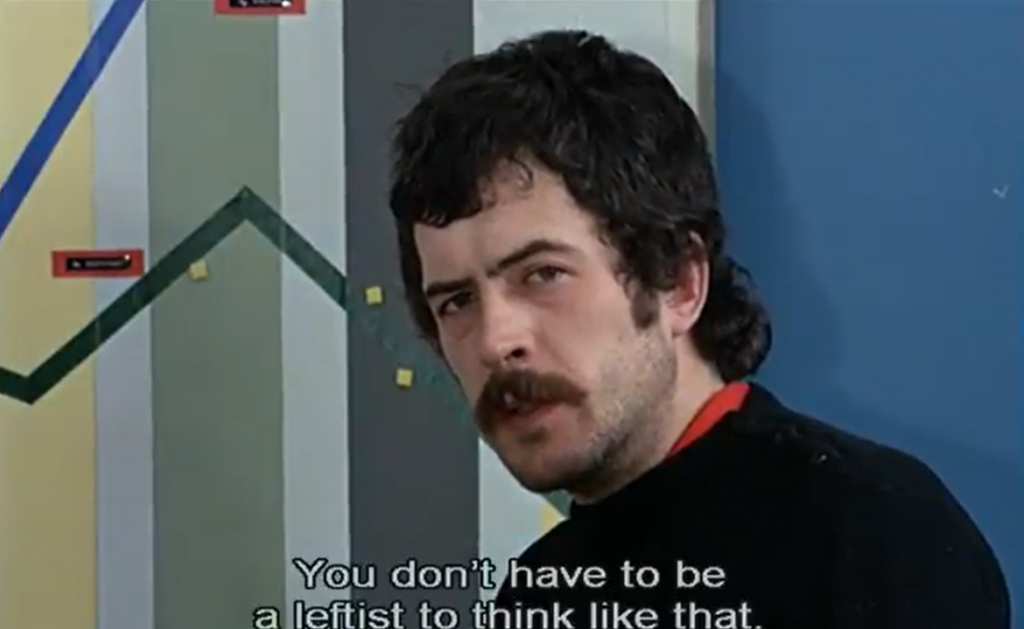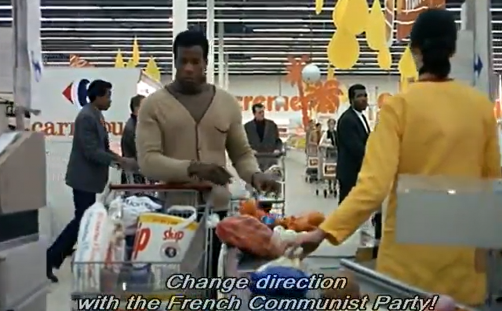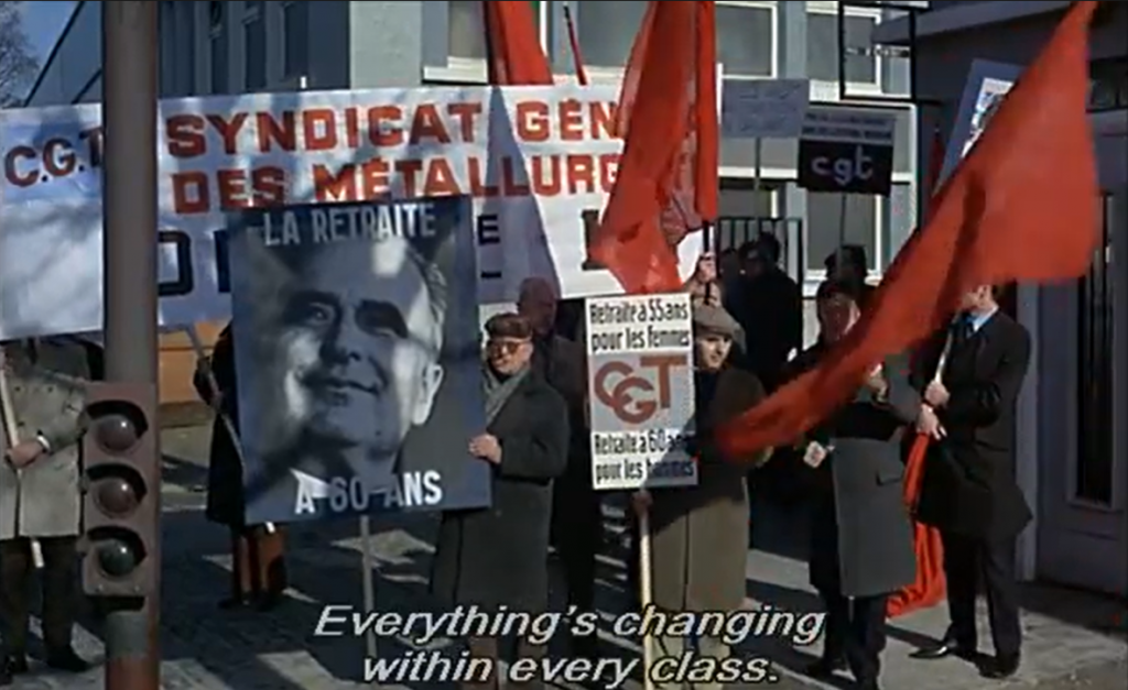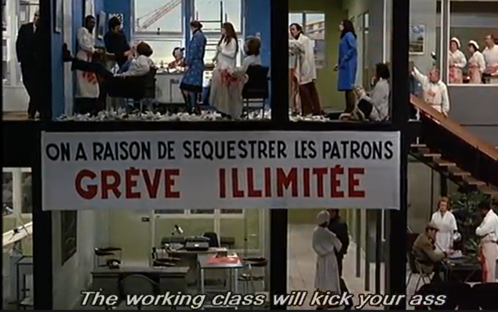While the characters are protesting and going on strike, they’re addressing their complaints and concerns to the government. But the way that Gorin and Godard film this, it feels like the people are talking to the audience and trying to express their concerns to the world this way.