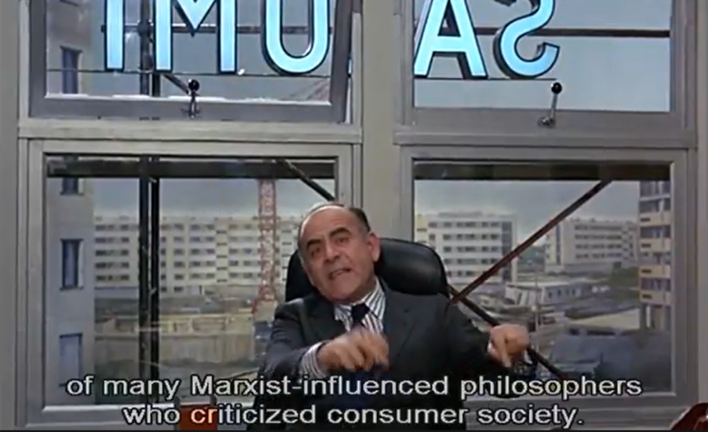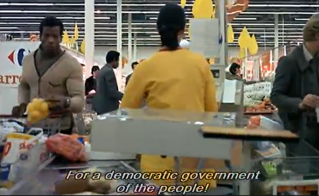 In this scene, a group of students rushes into the supermarket and starts publicly protesting. But while they’re chanting, the camera remains on the customers checking out. The students’ sounds and bodies stay in the background, and that’s exactly what the filmmakers were trying to portray: the customers ignoring the students’ protests and making them background noise.