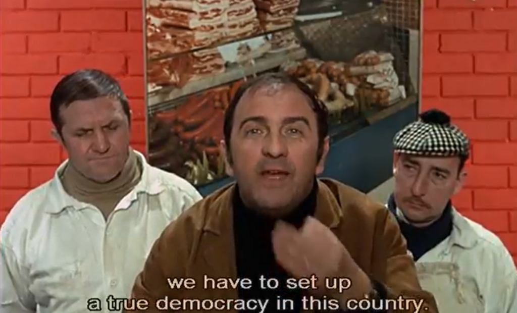 In this scene, it feels like it’s a cut from the film, as if we’re in an intermission. One of the directors are talking and explaining their vision for the political film.