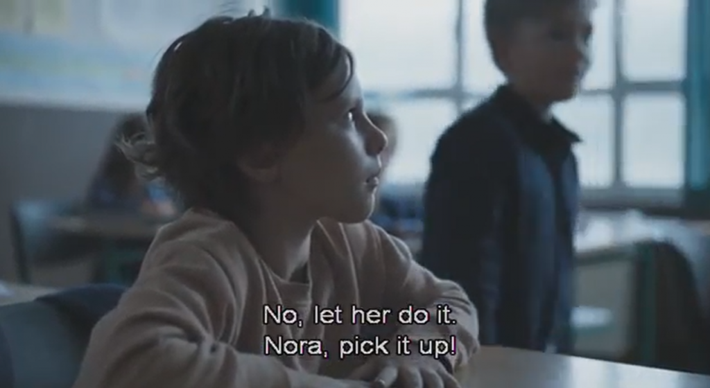 In this scene, I was able to find to factors of realism. The first one being that child throw tantrums when they’re upset. Nora pushed the notebooks off the table and refused to pick them up when the teacher asked. Second, the teacher scolded her, telling her to pick up the materials. Wandel is portraying to the audience that throwing a tantrum doesn’t help you. You have to be held accountable for your actions, regardless of whether you’re angry or sad.