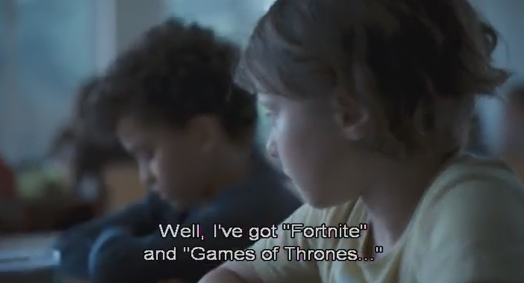 One of the main things of realism is depicting the real world to the audience, and in this scene that is very clear. Mentioning real world topics like social media is a good example of realism. In this scene, “Fortnite”, “Game of Thrones”, and “Tik Tok” are all mentioned. The mention of these topics kind of wakes up the audience, like “hey this is in the real world!” When “Tik Tok” was stated, I made me question how recent this film was made. These kinds of reactions are what makes the portrayal of realism successful.