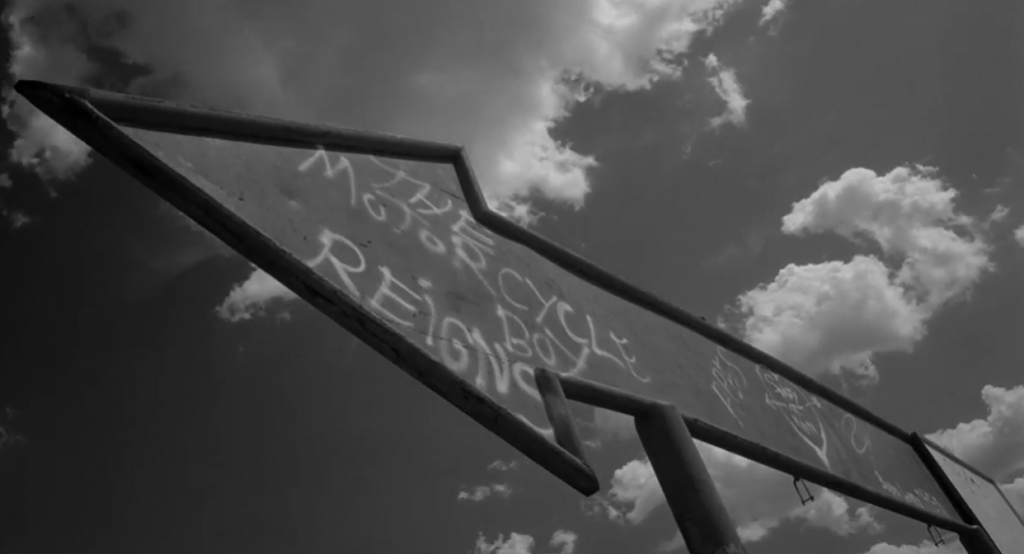 Rumble Fish” is a Crime/Action film directed by Francis Ford Coppola in 1983. The first frame at the start of the film is a sign with graffiti on it. This is how the world and setting is established. It is clear to the audience that crime is important in this film.