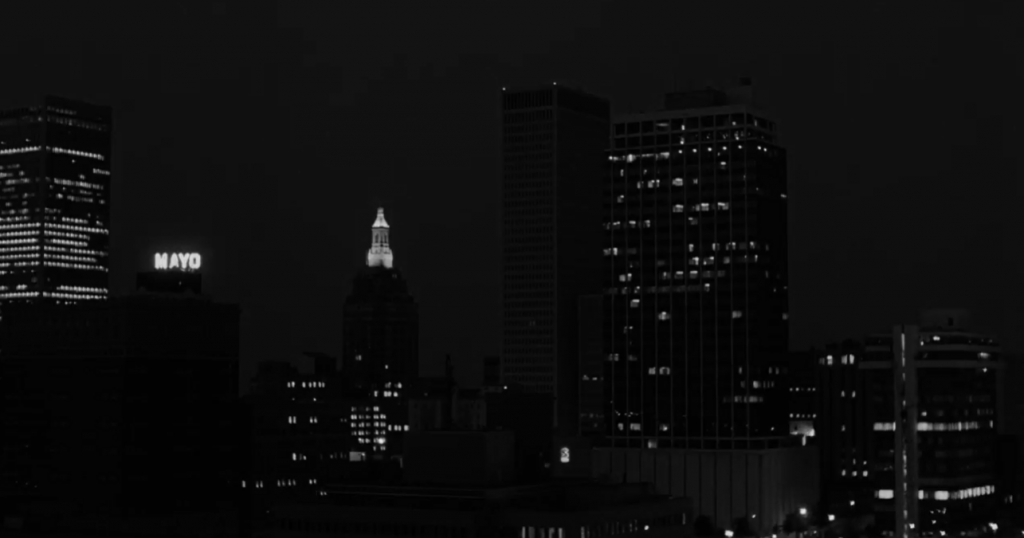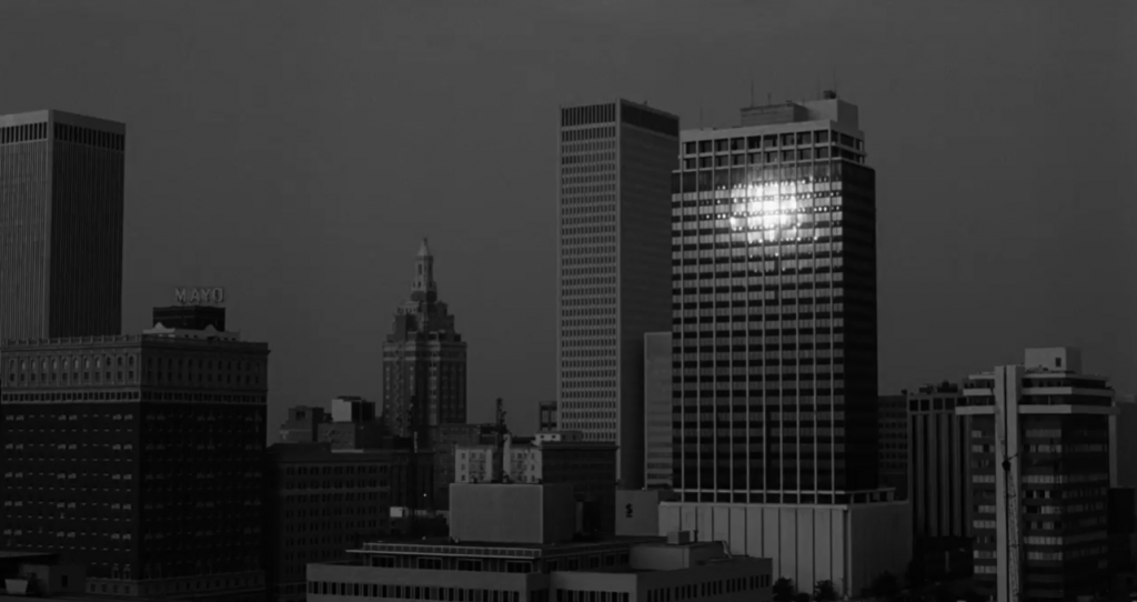 The reflection of the sun on the building, then the camera dims to show that the sun has set, and it’s nighttime. I feel like this is a good representation of realism and how time passes.