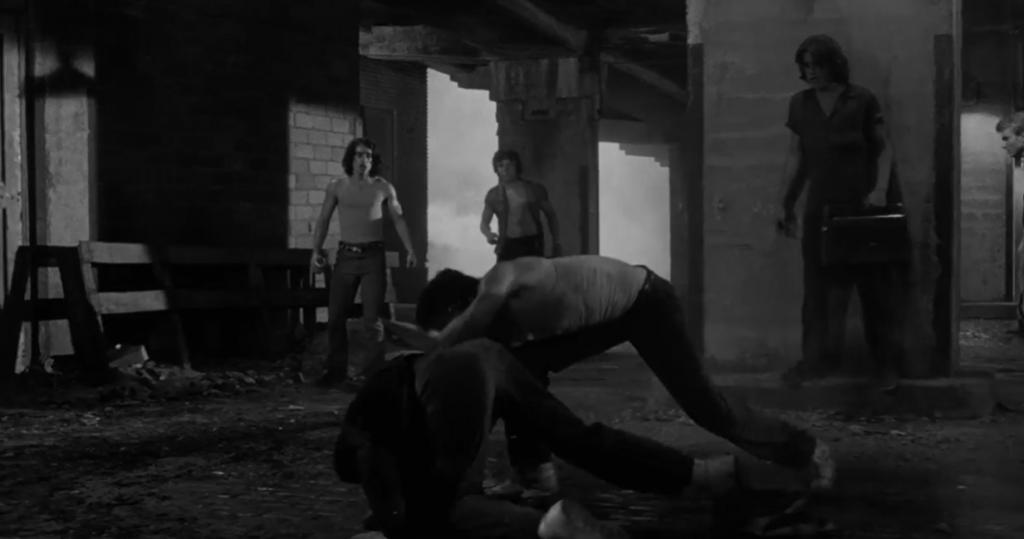 This whole scene is very exciting. The music is upbeat and quick while the characters are fighting, and the shouting of their friends adds to the emotion of the scene. The train in the background adds to the excitement because it highlights the danger they’re in. They’re not in some low-key alleyway; they’re in an active train station. Expressionism is evident in the way the camera shakes and has jerky movements while filming.